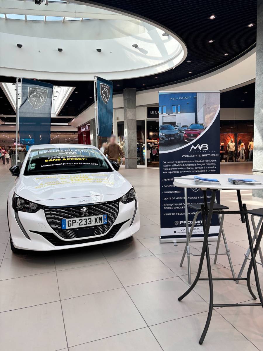 Nous sommes fiers d'annoncer notre toute première exposition de la Peugeot 208 électrique chez Leclerc à Grasse, Juste en face de notre partenaire @labrasserie. Nous vous proposons une offre à partir de 199 euros TTC, hors assurances et maintenance, sur stock disponible jusqu'au 28 avril.
